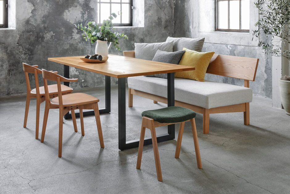 テーブルの片側をベンチ、もう片側をチェアにした組み合わせ。統一感を保ちながら使い勝手のバランスが取れます。(ナガノインテリア)