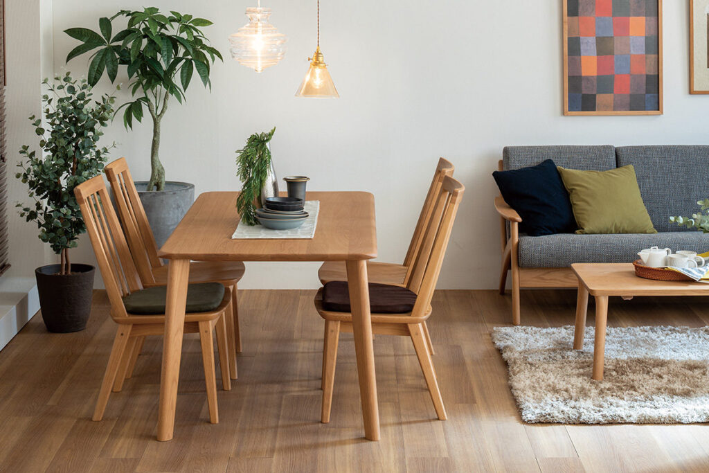 「リビングチェア」という名称ですが、ダイニングと組み合わせて使う方も多く、ソファとして置いてもダイニング兼用で使っても様になるバランスの良さも人気の理由のひとつです。